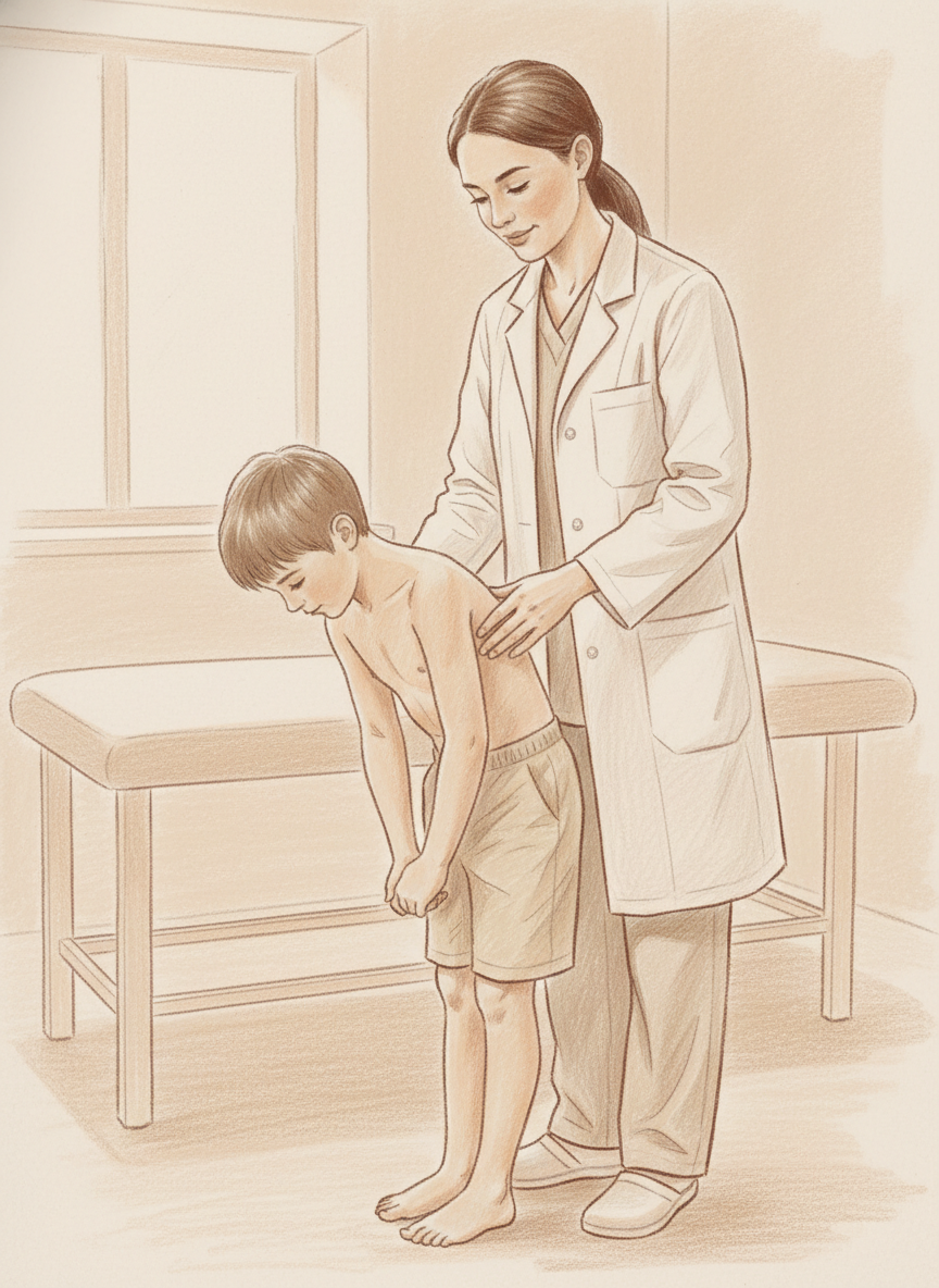 1. Клинический осмотр: Врач (ортопед, вертебролог) оценивает осанку, симметрию, проводит тест Адамса.