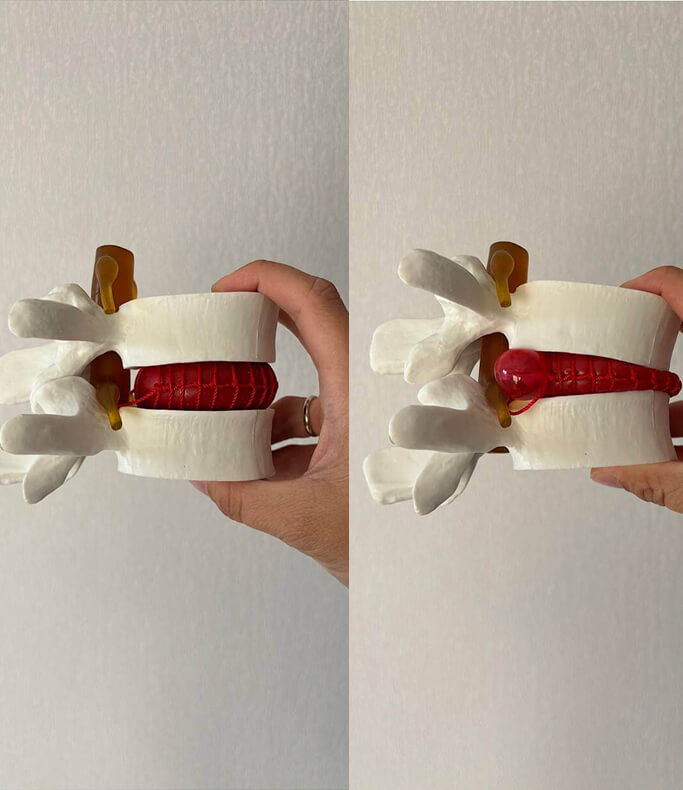Представьте, что вы сжимаете тюбик с зубной пастой не с двух концов, а с одного бока. Паста будет вылезать с противоположной стороны. Точно так же желейное ядро диска смещается назад, в сторону растянутого и ослабленного внешнего кольца.