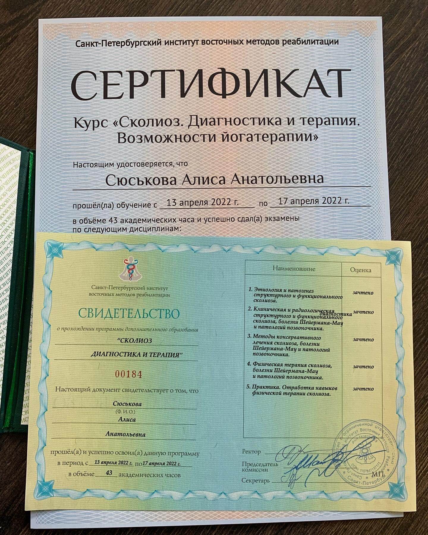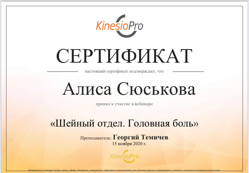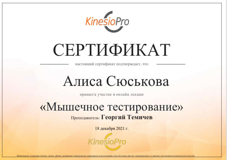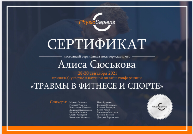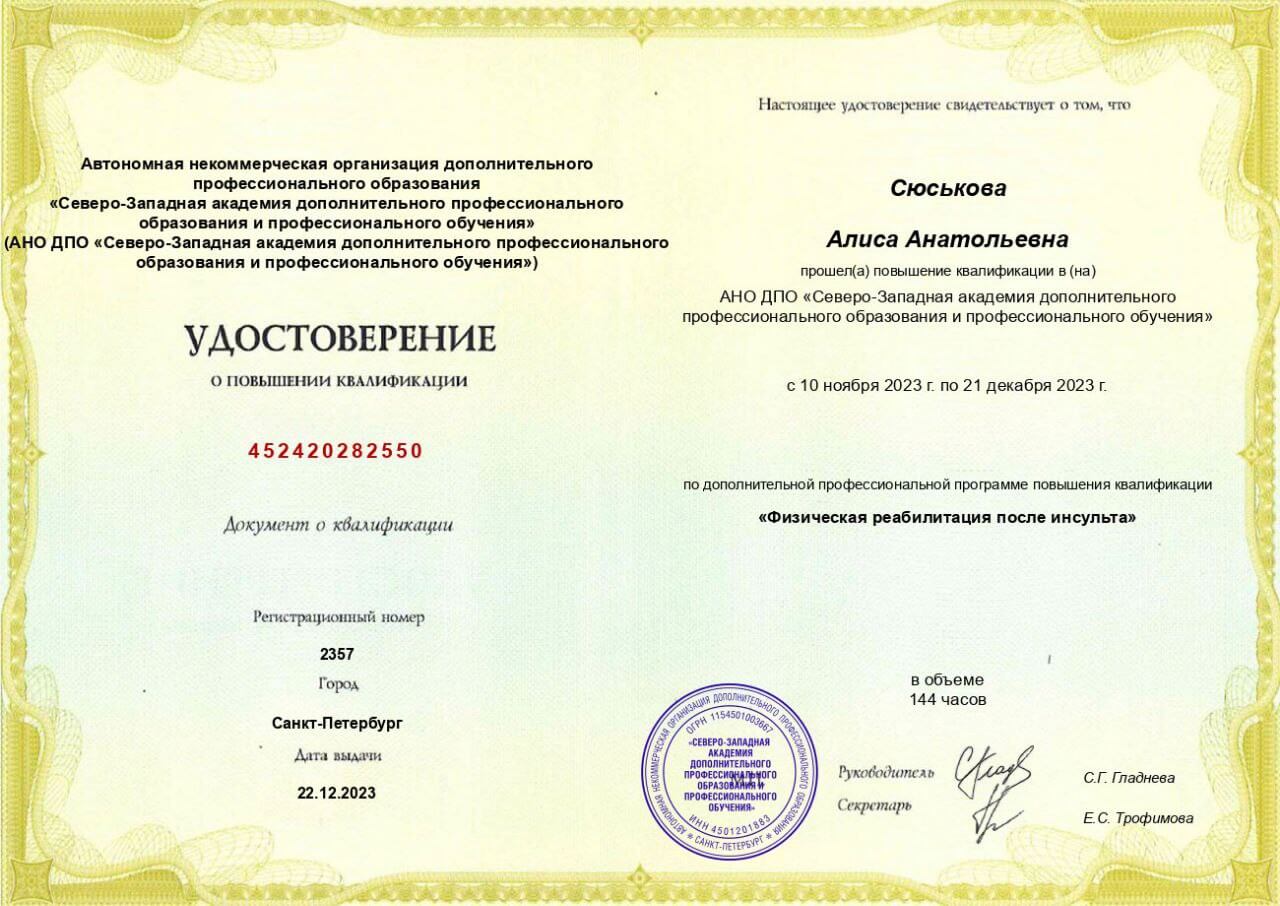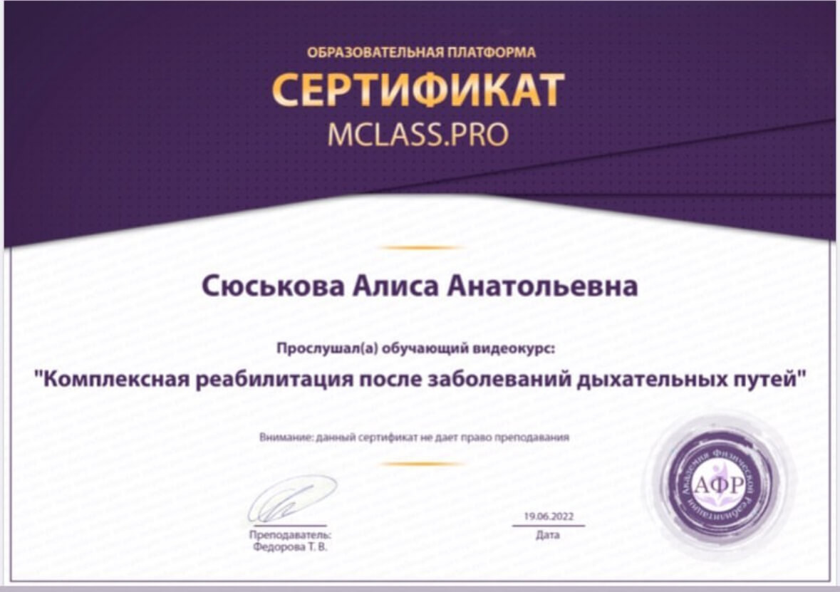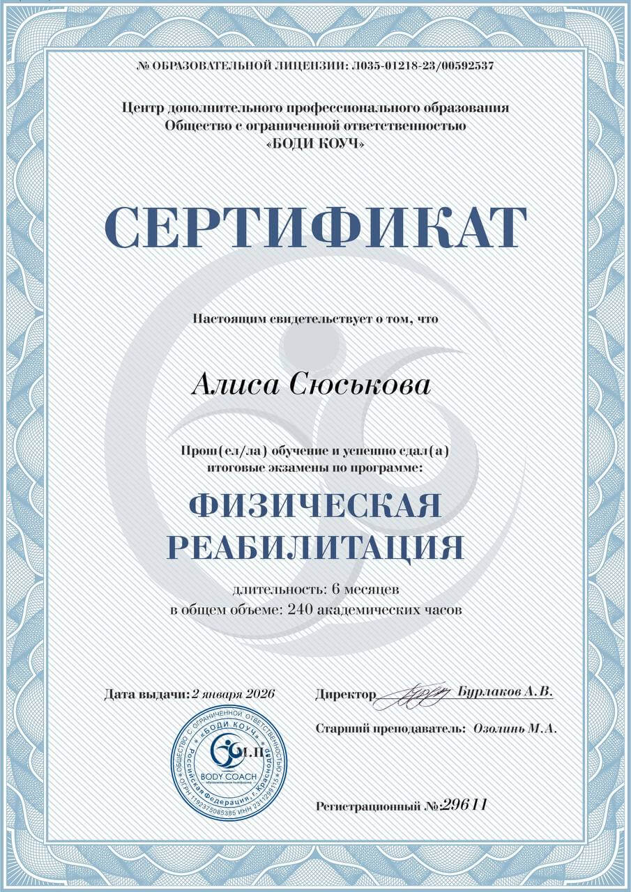 С 2014 года регулярно повышаю свою квалификацию, в области педагогики, психологии, оздоровления и спорта. Работаю с травмами опорно-двигательного аппарата и проблемами сердечно-сосудистой и дыхательной систем. Работаю со сколиозом по методике адаптивной физической культуры, ISST Schroth и SEAS. Опыт работы в сфере физкультуры и спорта 11 лет.