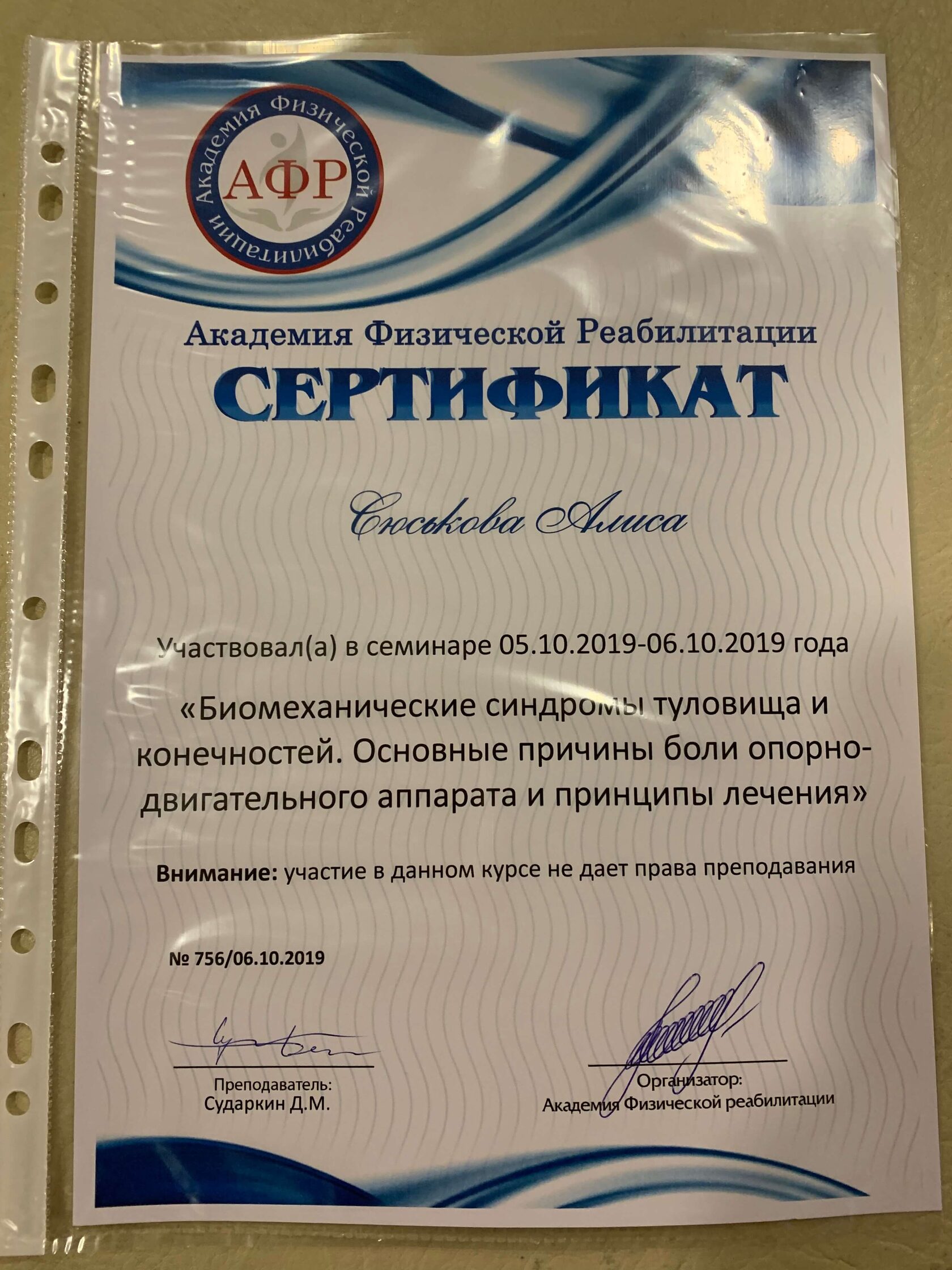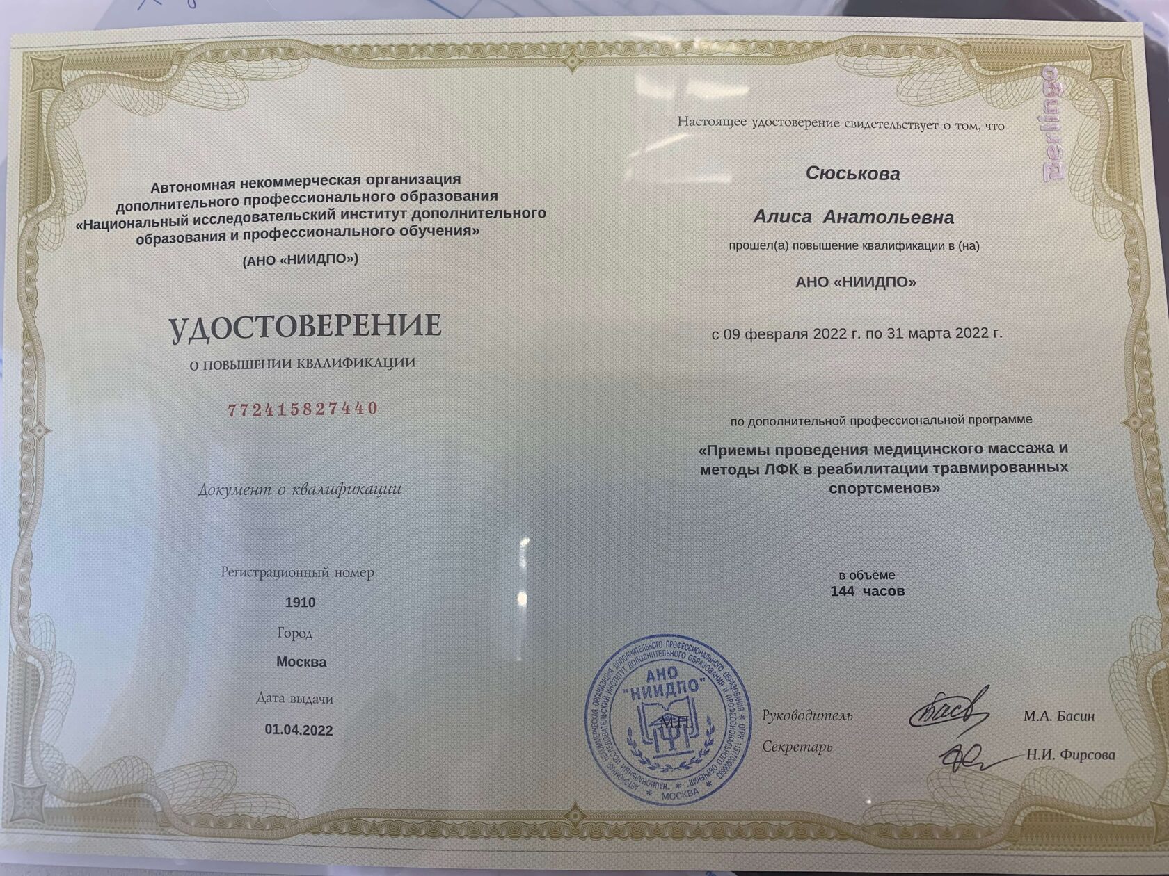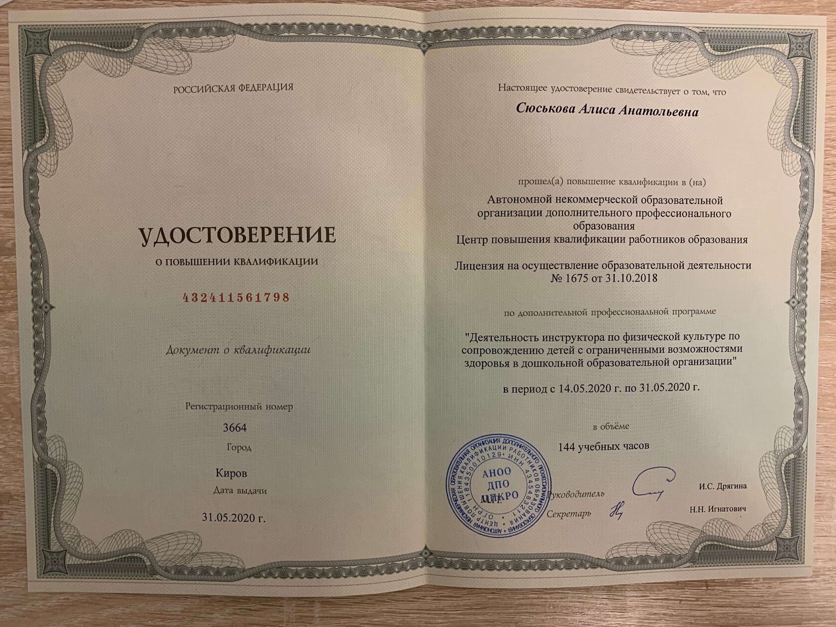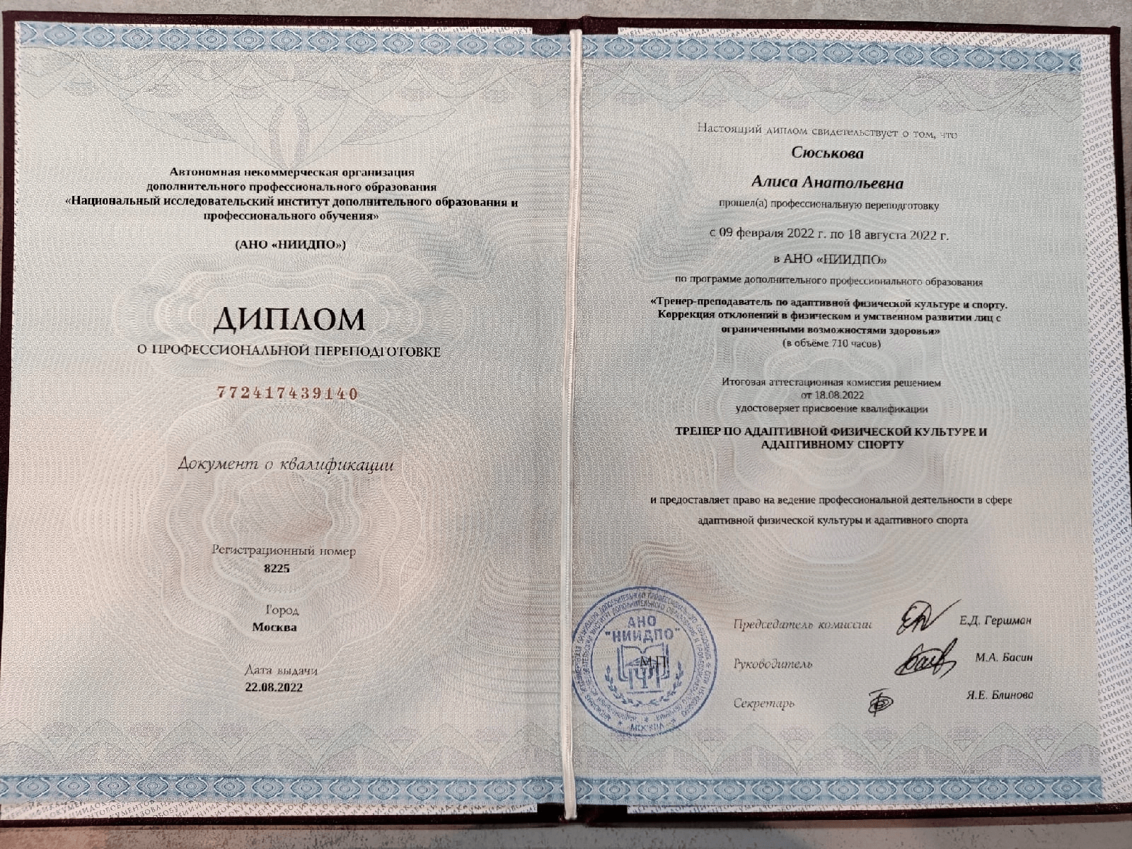 С 2014 года регулярно повышаю свою квалификацию, в области педагогики, психологии, оздоровления и спорта. Работаю с травмами опорно-двигательного аппарата и проблемами сердечно-сосудистой и дыхательной систем. Работаю со сколиозом по методике адаптивной физической культуры, ISST Schroth и SEAS. Опыт работы в сфере физкультуры и спорта 11 лет.